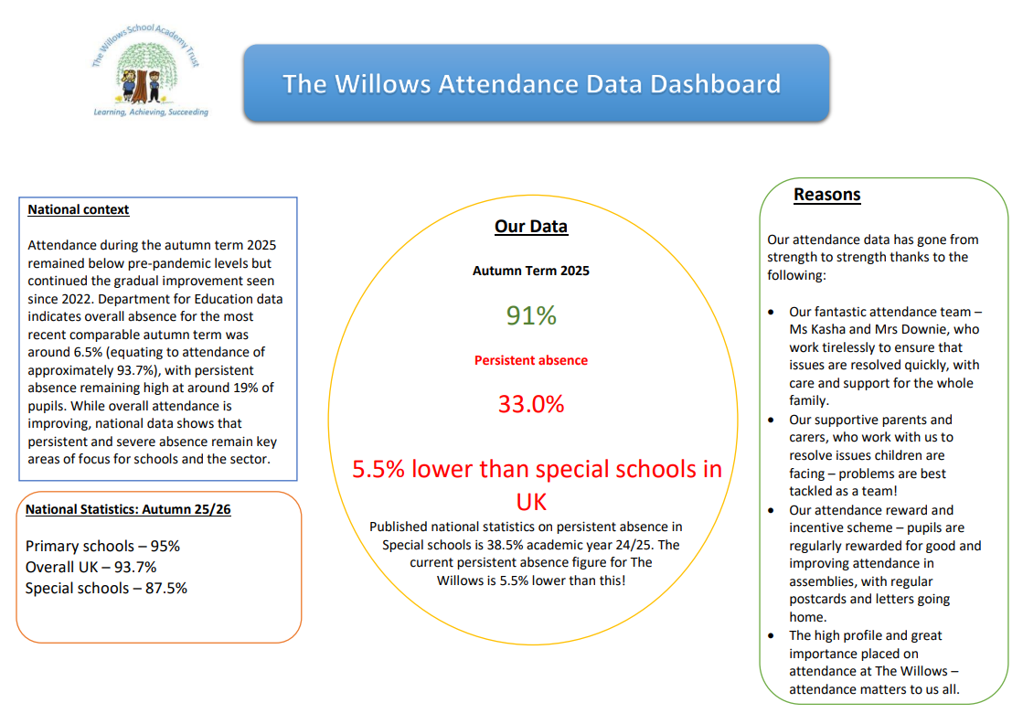 Here at The Willows School we aim for every child to achieve at least 95% attendance.